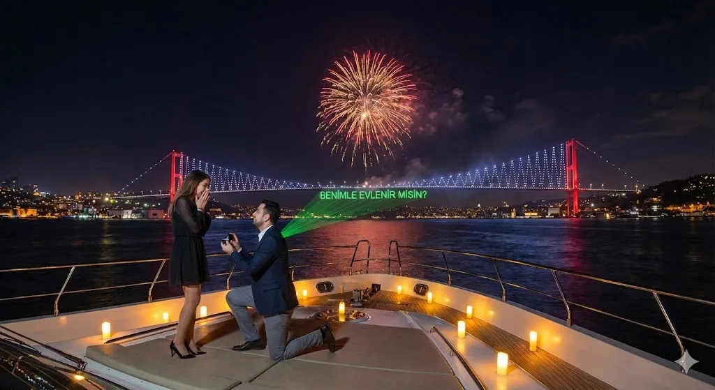 Havai fişekli evlilik teklifi, sadece bir soru sorma anı değil — başlı başına bir sahne performansıdır. Boğaz’ın gecesini aydınlatan ışıklarla, romantizmin en büyüleyici ve en gürültülü (mutluluk anlamında) halini yaşarsınız.