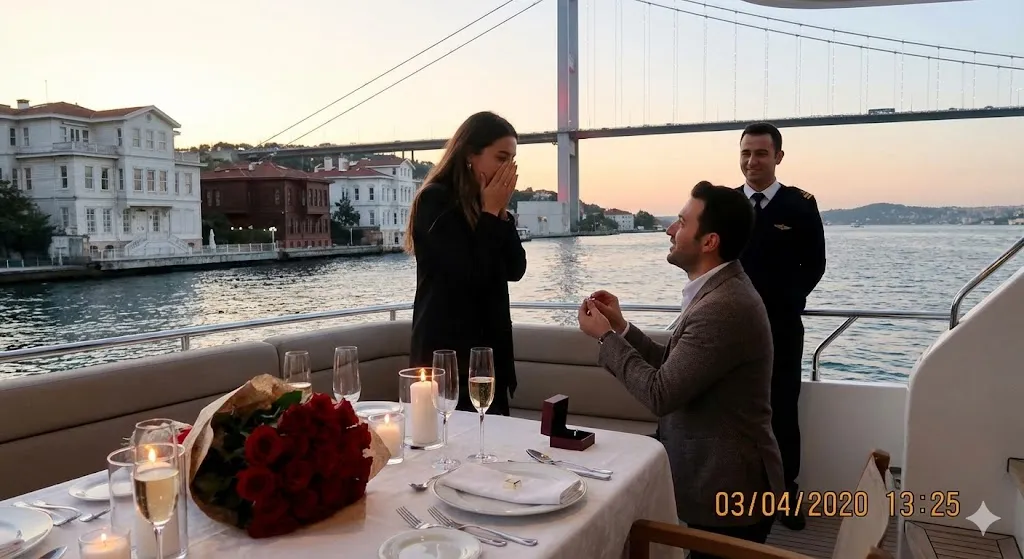 Bu lüks evlilik teklifi konsepti, hem romantizmi hem de prestiji aynı anda yaşamak isteyen çiftler için tasarlandı. Boğaz’ın büyüleyici ışıkları altında, özel menü, keman performansı, drone çekimi ve tam gizlilik garantisiyle her detay mükemmel işler.